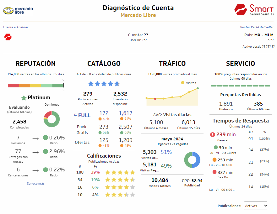Smart Dashboard BI permite analizar una amplia gama de parametros relacionados, incluyendo el tráfico de usuarios, puntuación de sellers, reclamaciones, devoluciones, tiempos de respuesta, ratio de conversión de ventas, ganancias netas, entre otros.