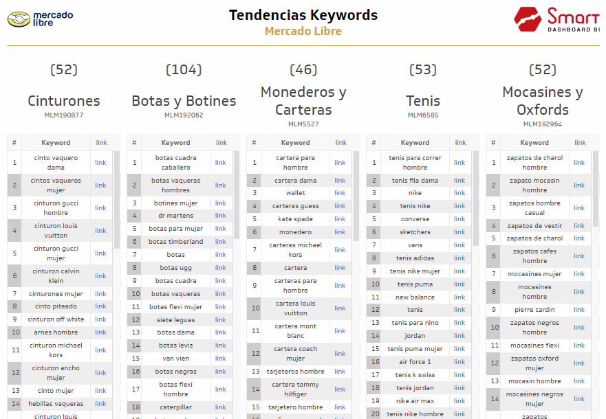 Toma a consideración las categorías relacionadas con los artículos a la venta y con base en ello entrega una serie de tablas donde se identifican las palabras clave más buscadas alrededor de cada uno de los productos.