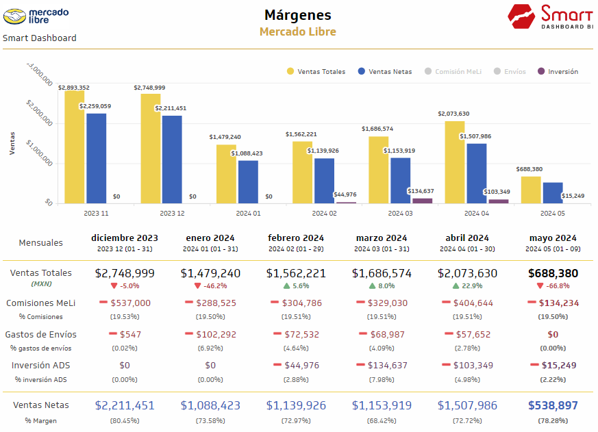 Muestra los costos por envío, comisiones por Mercado Libre y de ser el caso, por el dinero invertido en marketing durante dicho periodo de tiempo.